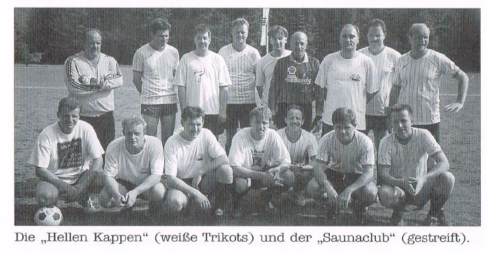 durchsetzen. In einem spannenden Endspiel setzte sich dann der TV Germania durch und konnte sich wieder in die Siegerliste eintragen. Das Einlagespiel stand dann ganz im Zeichen der ehemaligen Ostwiger Fußballgrößen, die sich nun dem Saunieren bzw. Kegeln zugewandt haben. Der Kegelclub „Helle Kappen" besiegte dabei überraschenderweise das .Dream-Team" vom ,Saunaclub«