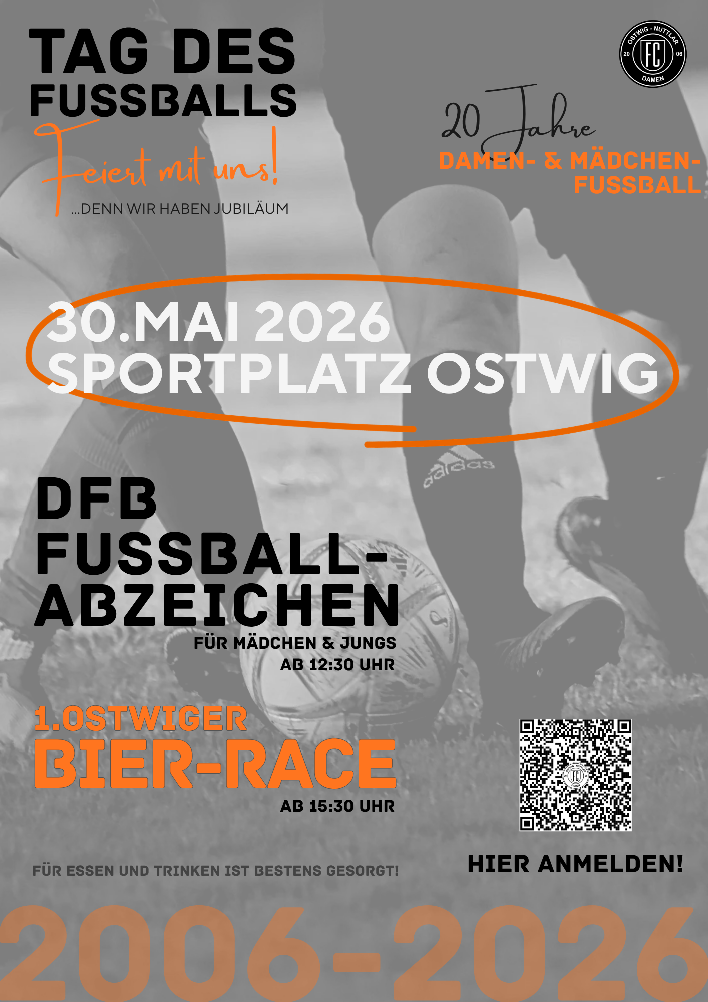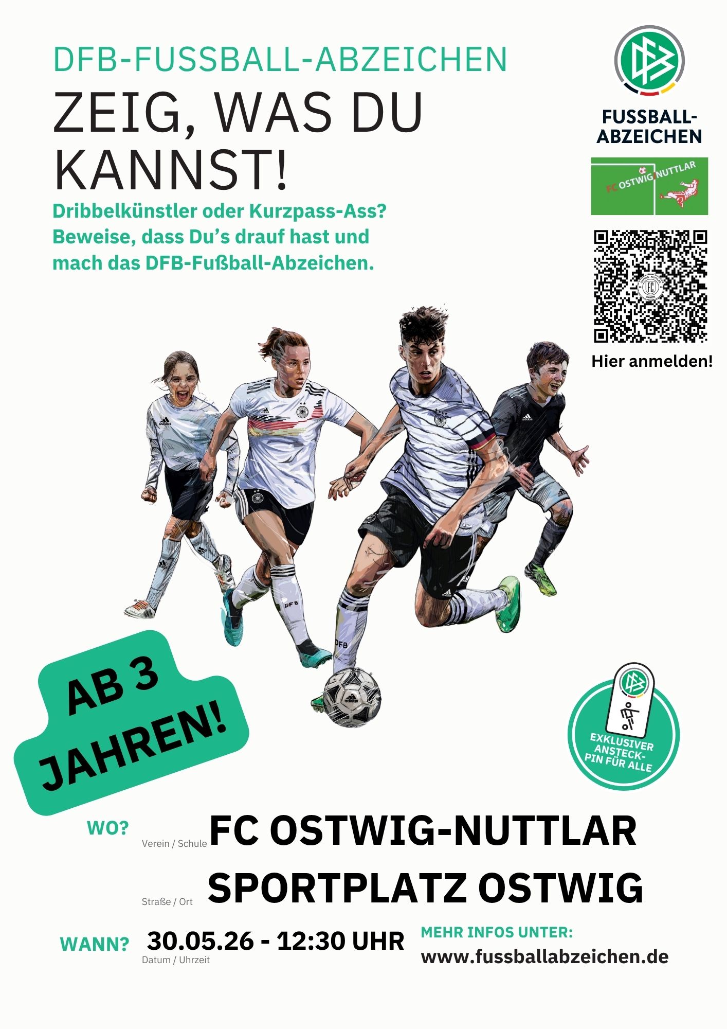 Am 30. Mai 2026 veranstalten wir ab 12:30 Uhr auf dem Sportplatz in Ostwig einen großen Fußball-Mitmachtag für Kinder und Jugendliche. An diesem Tag haben alle Fußballbegeisterten die Möglichkeit, das offizielle DFB-Fußballabzeichen des Deutschen Fußball-Bundes zu absolvieren.